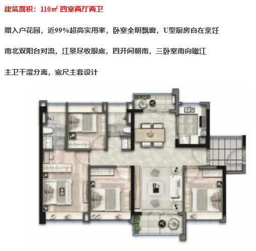 110㎡四室两厅两卫:赠入户花园,近 99% 超高实用率,南北双阳台对流,四开间朝南,三卧室南向瞰江。