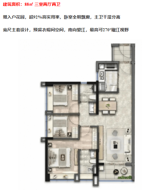 88㎡三室两厅两卫:赠入户花园,超 92% 高实用率,宽尺主套设计,预留衣帽间空间,南向望江,最高可 270° 瞰江视野。