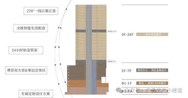 开发商广州城投作为市属国企,实力雄厚,项目整体定位高端,打造了一个集超甲级写字楼、江景住宅、特色商业于一体的综合体。建筑高度达到120米左右,规划了江景会客厅部分,主要集中在9到28层,总共只有96席,稀缺性非常明显。这种限量供应让每一位业主都拥有独一无二的私属感。