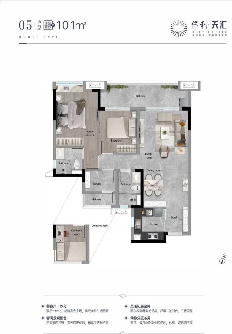 作为准现房发售,保利天汇敢于让业主提前检阅家的模样。五期产品在交标上全面升级,建面约99㎡三房设计紧凑实用,建面约131㎡四房阔绰通透。我们采用全明设计,动静分区,让每一寸空间都流淌着阳光与清风,兑现“看得见的品质”。