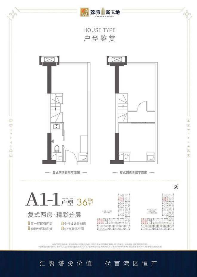 户型设计是荔湾新天地最吸引投资客和自住客的部分,主推36-93平方米的双钥匙LOFT产品,涵盖两房到五房多种组合。核心卖点在于4.5米层高的复式挑高设计,买一层实际能使用两层空间,赠送面积和拓展空间都比较可观。很多户型做到了全明格局,几乎没有暗厅暗卫,采光通风表现不错。