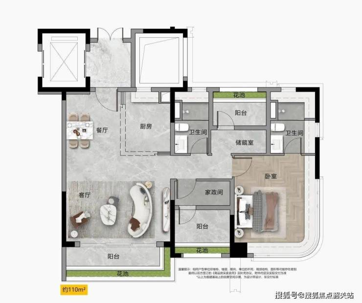 108㎡四房两厅两卫:独梯独户,南北通透,主卧270°转角飘窗,得房率95%;