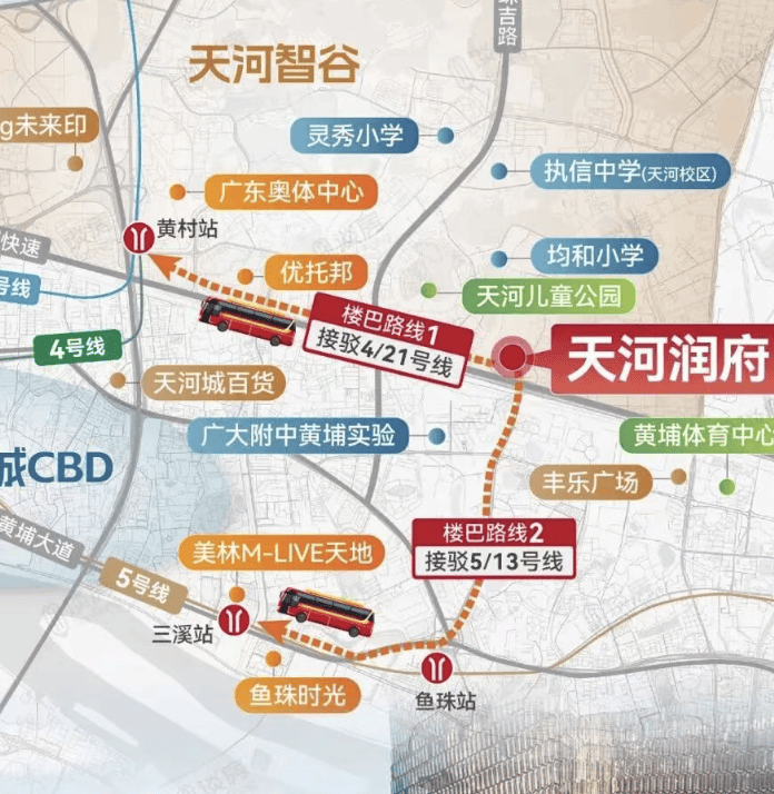 项目位于天河智谷核心区,广园快速路与珠吉路交汇处,距珠江新城约12公里、金融城约8公里、琶洲商圈约10公里,自驾非高峰期至珠江新城仅需18分钟。地铁方面,项目距4号线黄村站、21号线棠东站直线距离约3公里,提供免费楼巴接驳;规划中的19号线吉山站(待建)将进一步缩短通勤时间。此外,茅岗路北延段拓宽工程(由双向2车道拓宽至双向6车道)计划2025年底通车,彻底解决出行瓶颈。