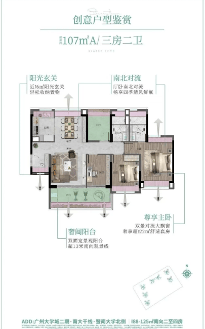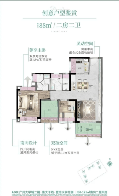 越秀大学星汇城的设计理念注重实用性与美观性的结合,户型设计灵活多变,满足不同家庭结构的需求。从88㎡至125㎡的多种户型,每一种都经过精心设计,以最大化利用空间,创造舒适的生活环境。例如,125㎡户型不仅拥有4.5开间朝南,还配置了南北对流的客餐厅,让阳光和清风自由穿梭。