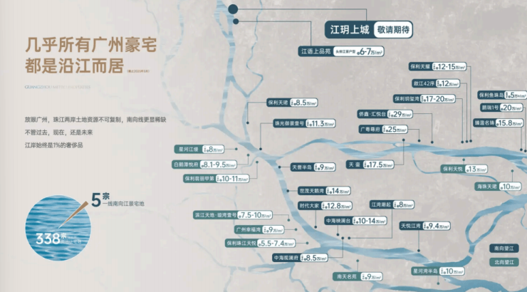 江玥上城落子于 “江岸创研宣居组团”,它是这片热土的居住配套,更是撬动这个发展重心的一个完美支点。项目距离珠江仅约 80 米,拥有 270° 环幕江景视野,是广州主城稀缺的一线江景住宅,在珠江前 30 公里的江岸开发中,这样的低密滨江 TOD 奢宅找不出第二个。
