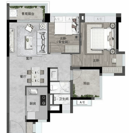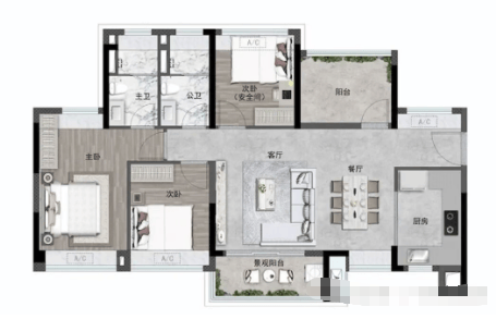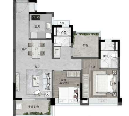 横厅设计,客厅面宽达6.2米;景观阳台约5.5米面宽,连接次卧;
