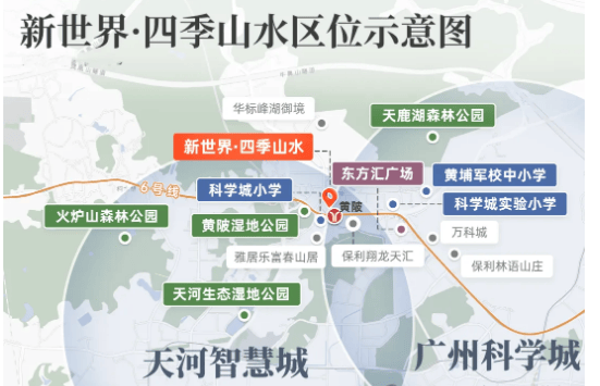 新世界·四季山水坐落于广州东进第三科创中轴核心,地处天河智慧城与黄埔科学城双芯交汇处,周边珠江新城、金融城、琶洲三大CBD环绕,区位优势得天独厚。项目紧邻广汕公路,无缝衔接天河、黄埔两大核心区域,既能享受科学城的产业红利,又能便捷通达天河的成熟配套。