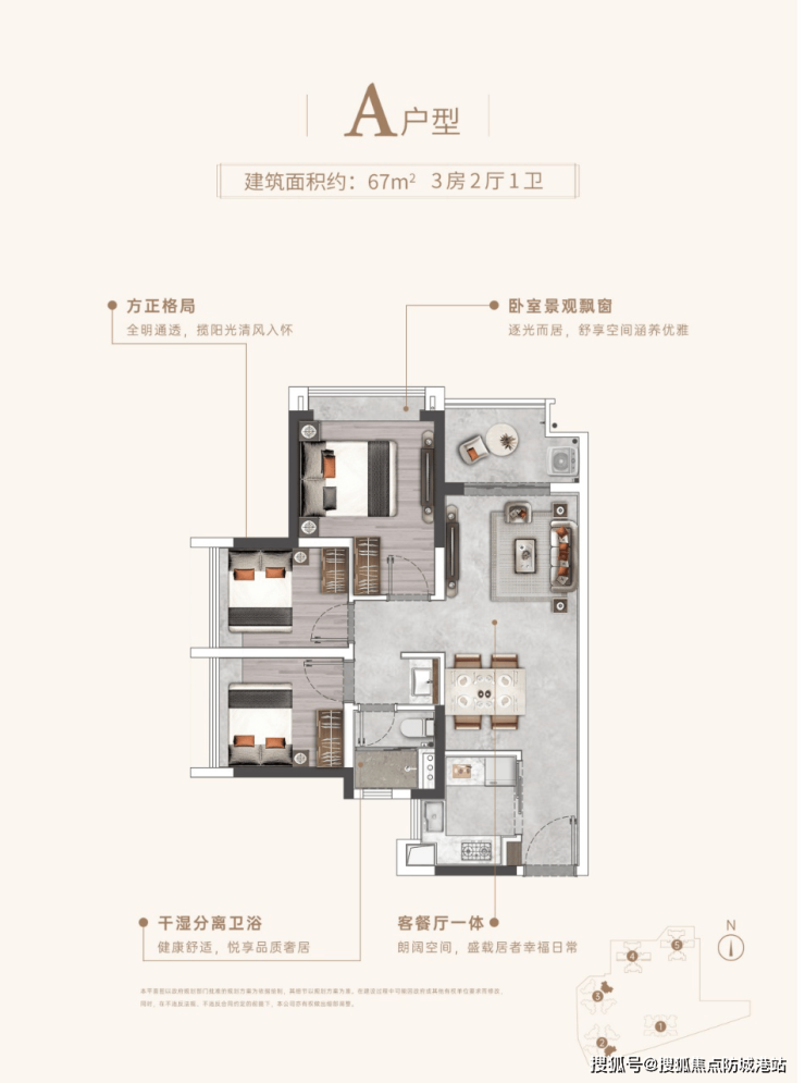 67㎡三房:实测得房率92%,餐客一体+U型明厨,适合年轻家庭。