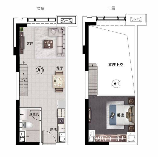 约49.72㎡灵动LOFT,最大的亮点就是约4.5米层高,一层价格享受双倍空间,性价比极高,适配自住、办公等多种场景。挑空客厅设计,彰显阔尺感,让空间显得更加宽敞明亮,提升整体居住体验。餐厨客一体布局,延伸生活场景,增强空间的通透性和实用性,无论是家庭聚餐还是朋友小聚,都能轻松容纳。整层主卧设计,静谧独立,保障业主的私密性和舒适度,让业主能够拥有安静的休息空间。上下灵动分区,功能随心而变,上层可作为卧室、书房,下层可作为客厅、餐厅、办公区,空间利用率极高,满足不同人群的需求。