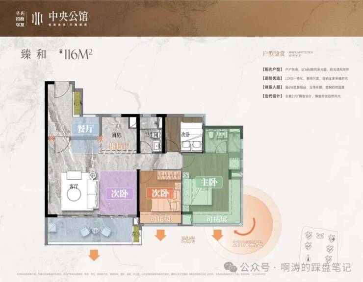 建面约 120㎡的四房两厅两卫户型,是改善型购房者的优选户型,采用了南北通透的横厅设计,搭配 6 米以上的宽景大阳台,实现了极致的采光与观景效果,客餐厅一体化的设计,最大化拓展了公共活动空间,无论是家庭日常居住,还是亲友聚会,都能拥有充足的空间,四个房间分布合理,动静分区明确,主卧采用豪华套房设计,搭配独立卫生间、衣帽间与全景飘窗,舒适度与私密性拉满,可完美满足二胎家庭、三代同堂的居住需求,实现一步到位的改善置业。