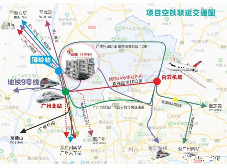 项目构建城轨衔接、高速环绕、路网通达的全方位交通体系,有效串联广州主城区、花都新华核心、清远同城片区,满足日常通勤、跨城出行、自驾远行等多元出行需求。项目距离广清城际铁路狮岭站直线距离 1.1 公里,广清城轨全线已正式通车运营,班次稳定,可快速直达花都汽车城、广州北站,无缝衔接广州轨道交通网络,实现广清一体化快速通勤。自驾路网层面,项目 5 分钟车程即可抵达钟屋收费站、马岭收费站两大高速出入口,无缝接驳许广高速、珠三角环线高速两大区域主干高速。经广清高速前往花都新华城区仅需 15 分钟车程,经红棉大道通行耗时约 30 分钟;沿高速路网向北直达清远城区,向南快速接入广州绕城路网,30 分钟车程直达广州白云国际机场,快速通达白云、越秀、天河等广州主城核心片区。项目周边城市支路四通八达,接驳片区公交路网,覆盖周边社区、学校、商圈、农贸站点,公共出行与自驾出行双向完善,全方位降低跨城通勤与日常出行成本。
