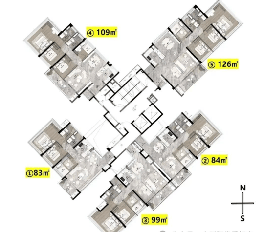 项目主打三大主力户型:84㎡三房、109㎡四房及126㎡五房。84㎡户型实现四开间朝南,全南向布局,采光通风优越;109㎡户型采用南北对流设计,配备约800库玄关,可灵活改造为宽厅,提升空间感;126㎡五房则做到5.5开间朝南,主卧享有270°采光视野,满足多孩家庭或三代同堂的居住需求。所有户型均基于新规优化,实用率突破100%,在同面积段中提供更大实际使用空间,显著提升性价比。