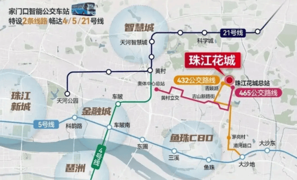 交通方面,珠江花城为业主提供了多元高效的出行选择。小区门口即设智能公交首末站,465路直达地铁4号线/21号线黄村站,432路接驳5号线大沙地站,通勤无需辗转。自驾出行同样便捷——距离广园快速路不足1公里,20分钟畅达珠江新城,10分钟抵达金融城,40分钟可达白云机场。更值得期待的是,规划中的地铁19号线、23号线及鱼珠过江隧道建成后,区域交通能级将进一步跃升,珠江花城的区位优势将更加凸显。