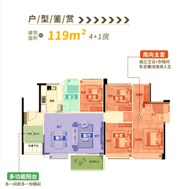 改善型买家可关注119㎡四房两卫户型,总价550-610万。客餐一体化设计提升空间感,双次卧布局兼顾老人照护与孩子独立学习,完美适配三代同堂或成长型家庭。