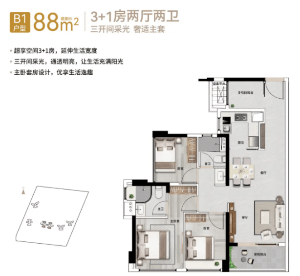 对二胎家庭或追求更高居住品质者,88㎡三房两卫“3+1空间”设计尤为亮眼。三开间朝南、南北通透,额外创意空间可灵活改造为书房、儿童活动区或客房,总价365-400万,性价比突出。