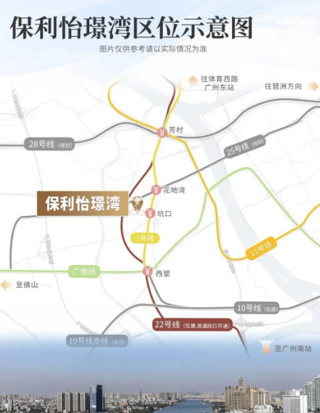 保利怡璟湾距离地铁1号线坑口站步行可达,仅约600米的距离使得通勤十分便捷。通过芳村 TOD 换乘11号线环线或广佛线,可以轻松到达珠江新城等地。此外,周边还有多条公交线路,自驾出行也十分方便,可通过东漖北路和东漖南路快速接驳环城高速、广花高速等主要道路。
