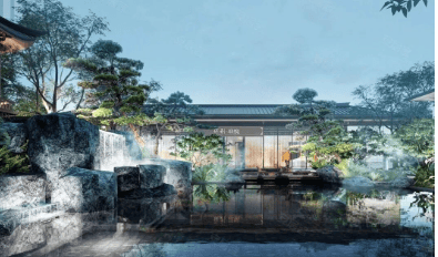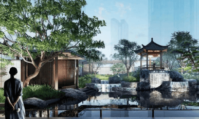 保利琅悦整体采用纯T2板楼设计,楼栋北高南低,承接南风入室,实现良好通风采光。建筑外立面融合东方美学,楼顶凤鸟纹设计寓意步步高升,建筑立面参考古代礼器玉琮造型,基座入户大堂采用高定景墙和铺装,突出归家仪式感。园林规划秉承宋式礼制理念,以中轴对称布局形成“一园三堂”,三大主题园林分别为门庭山水隐园、东方雅奢花园、下沉榕巢乐园,实现“可行、可望、可游、可居”的东方雅素意境。松石间意与林间雅苑借古琴与石梁桥元素营造社交与休闲空间,下沉榕巢乐园则为全龄互动自然体验区。
