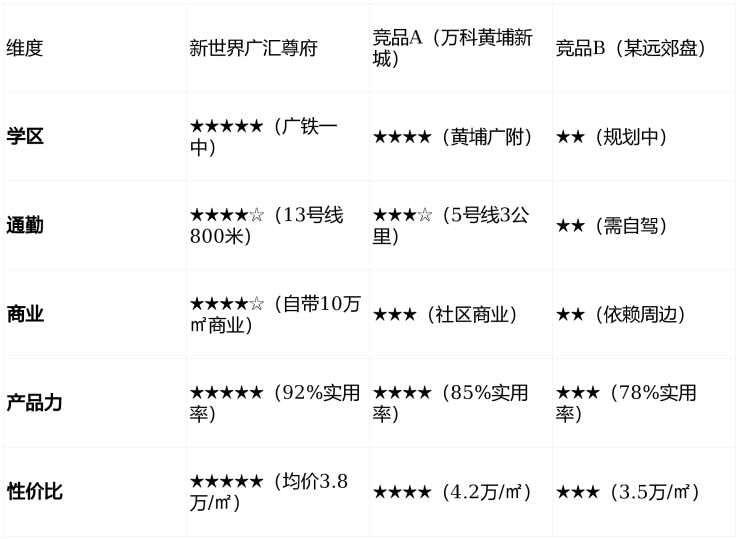 竞品对比:与万科黄埔新城相比,广汇尊府学区更优、通勤更近,但总价略高;