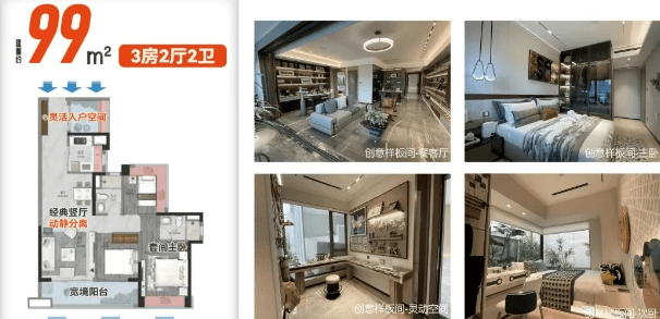 南向约99平方米3+1房2卫:南向约6米阳台,尽揽自然景观;主卧套房设计,保障私密性。
