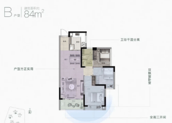 产品力是天健东玥台的核心竞争力。项目主力户型为84.85㎡三房、96㎡三房及110㎡四房,均采用全南向设计,实现户户朝南、全天候采光。得益于科学布局与精细化设计,实际得房率高达85%,远超市场平均水平。2梯4户配置兼顾效率与舒适,层高3米提升空间感。部分户型更配备独立主卧卫浴、阔景阳台,兼顾功能与尺度,精准契合刚需上车与家庭改善双重需求。