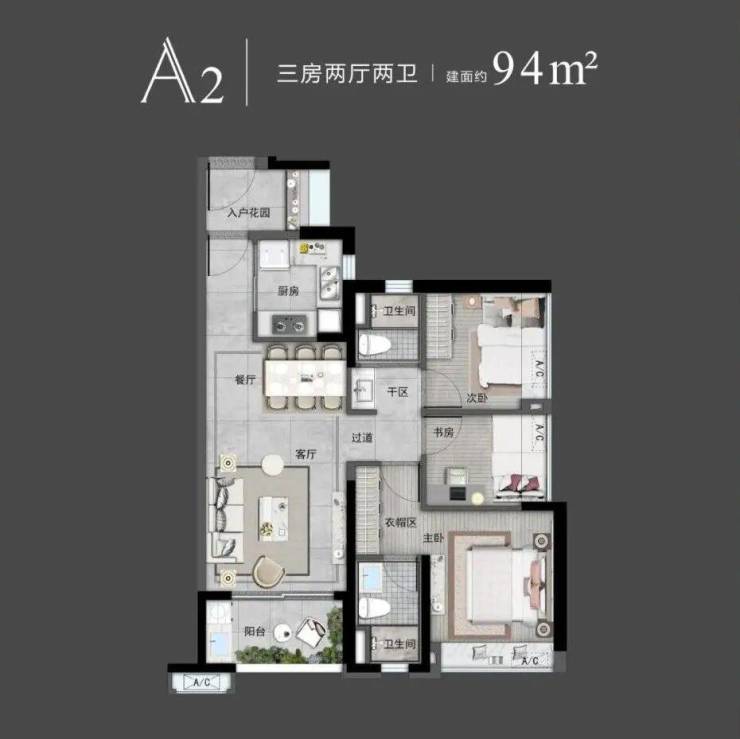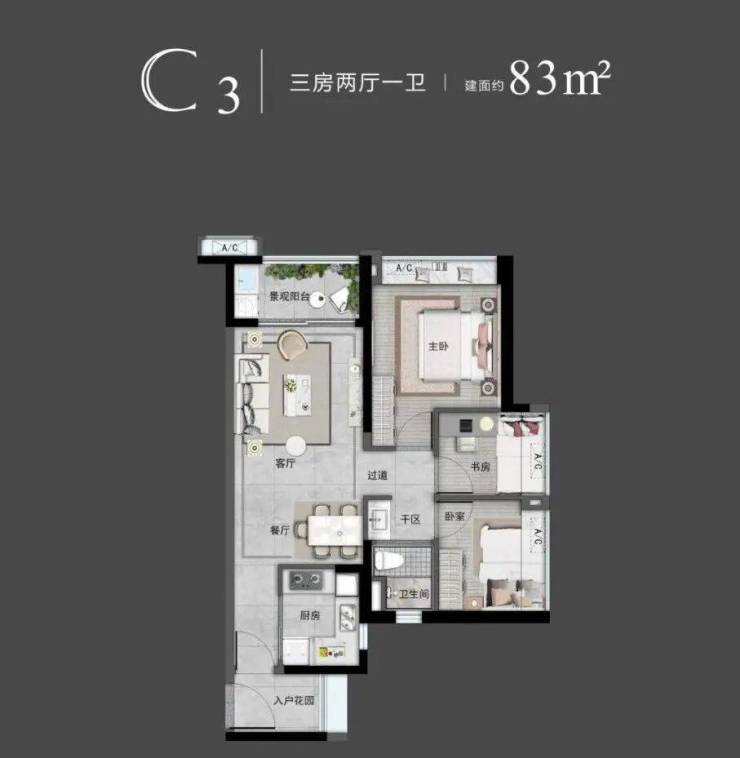 户型设计:主力89㎡三房,得房率与动线兼顾