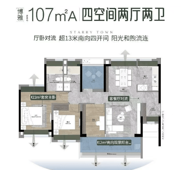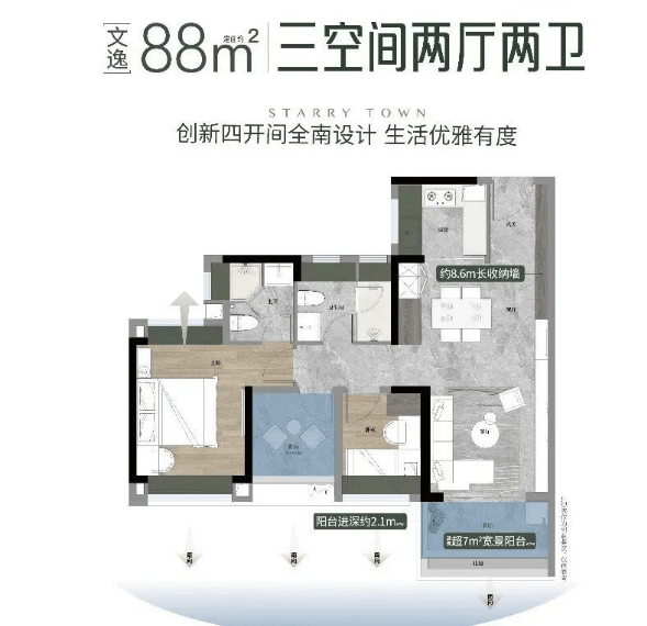 特点:四面宽小户型,朝南居家生活;超11米景观线,与阳光无限亲近;精细化收纳,约10米收纳墙。