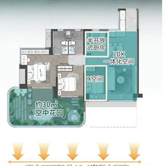 2. 110平方米四房:LDK一体化设计,客厅开间6.8米,空中花园面积达33平方米,可改造为“4+1房”,实用率139%-141%。