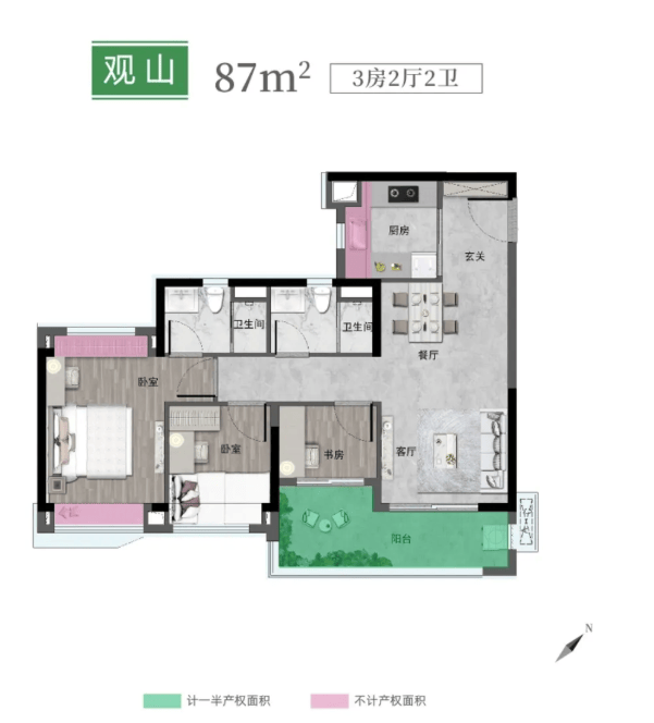 这款户型被称为“王牌户型”,完美平衡了舒适度与实用性。全南向四开间设计,三个卧室朝南,主卧带独立卫生间,私密性极佳。经典的竖厅布局,南北通透,空气对流顺畅。约5.6米的L型大阳台,超11米的南向展面,让您在客厅就能欣赏到美丽的园林景色。无论是三口之家还是二胎家庭,这款户型都能满足您的需求。