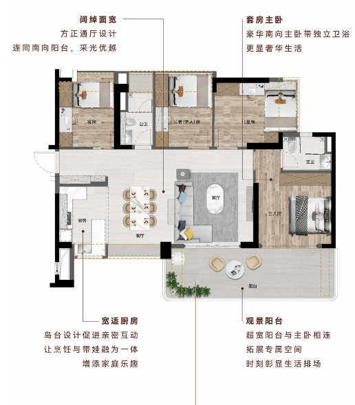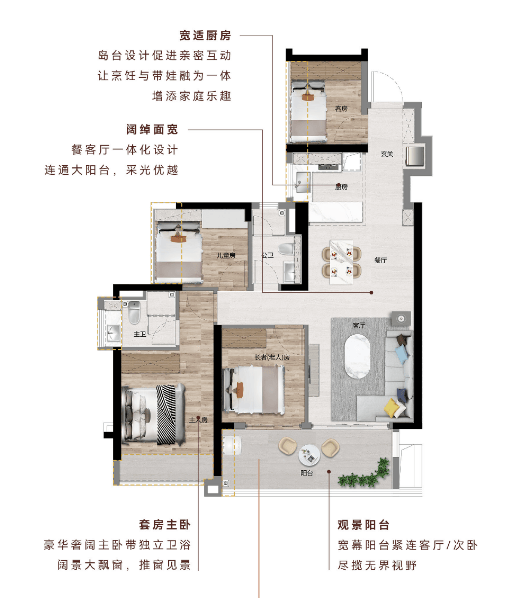 5. 06户型 建面约129㎡ 4房2厅2卫:配备6.8米宽阔阳台,空间极具震撼力,可打造为休闲、观景、晾晒等多功能空间;南向直面珠江景观,江景视野绝佳;U型厨房设计,操作便捷;采用LDK一体化设计,将客厅、餐厅、厨房融为一体,空间通透开阔,便于家人互动交流。