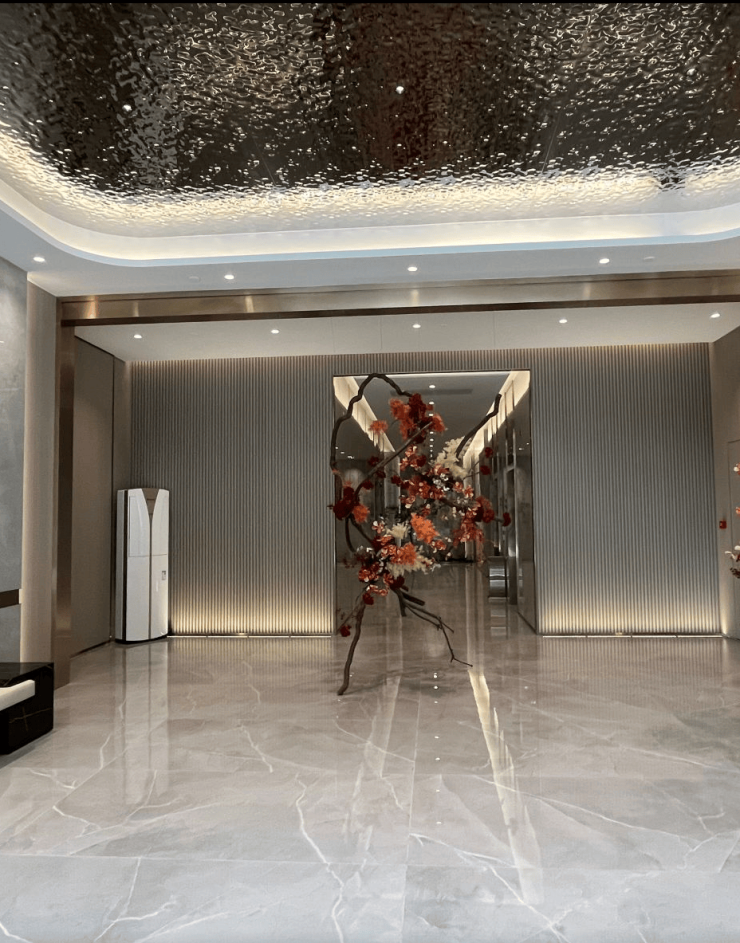 从工程建设细节来看,项目裙楼采用铝板外立面,质感十足,尽显品质感;入户大堂采用挑高设计,顶部弧形顶面搭配金属包边腰线装饰,辅以艺术装置和绿植点缀,现代格调浓郁。目前,项目主体结构已全部完工,正在进行内部装修和公共区域装饰工程,各项工程严格按照施工标准推进,确保按时交付。