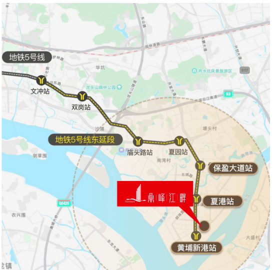 4. 2025年12月5日,地铁5号线东延段(黄埔新港站-麻涌站)正式进入试运行阶段,预计2026年上半年可正式开通运营。该线路开通后,将进一步完善广州东部交通网络,加强黄埔区与东莞市的交通衔接,新福港鼎峰江畔项目业主的跨城通勤将更加便捷。