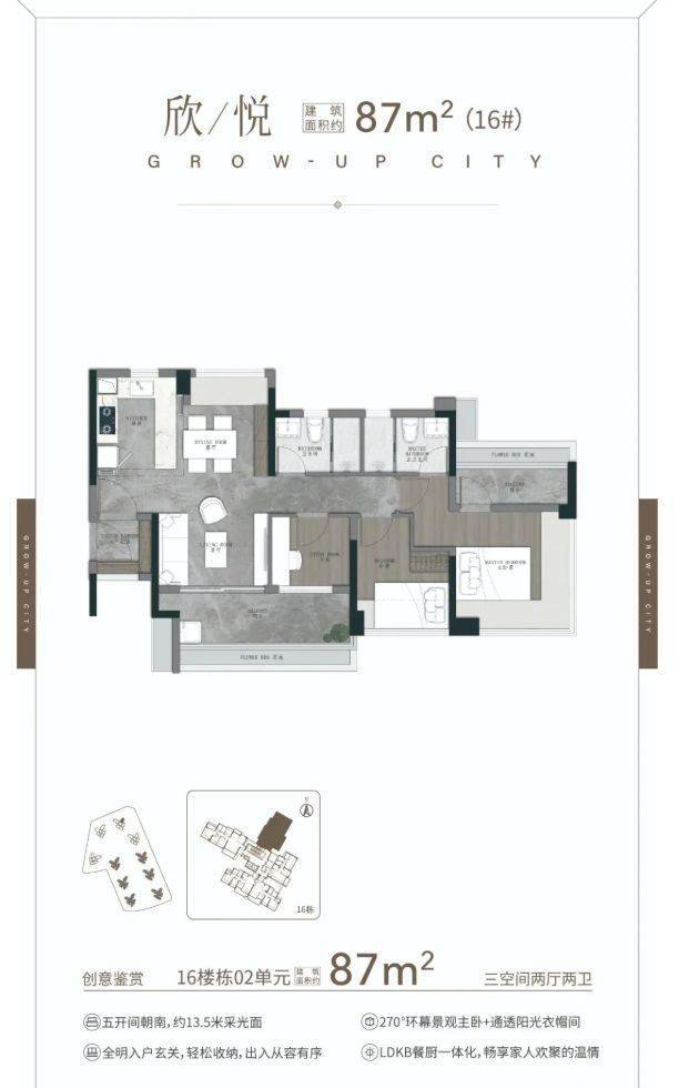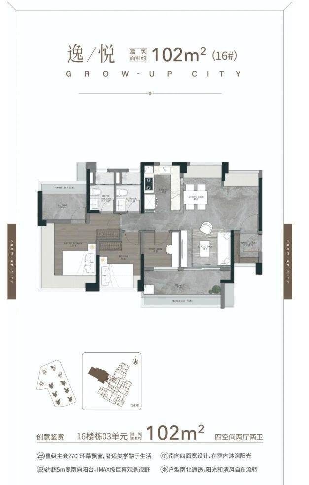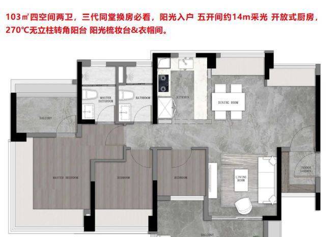 户型设计亮点满满,得房率超 100% 。二期加推 76 - 125㎡全南朝向 3/4 房。75㎡四开间朝南,全明转角玄关、开放式厨房、开阔景观阳台;86㎡南向 4 开间,约 11.1m 采光,跑道式阳台;103㎡五开间采光,270℃无立柱转角阳台;125㎡五开间朝南,南北双阳台。每个户型都根据不同家庭需求设计,空间利用超合理。