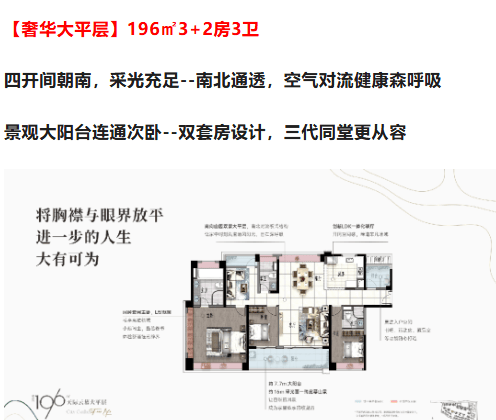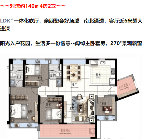 143㎡4 房 2 卫:改善型平层,四开间朝南,约 7.2 米宽景阳台,头排山景无遮挡;主卧套房带步入式衣帽间与双飘窗,居住舒适度拉满;入户花园设计,进门可放置鞋帽,实用性强;适合多子女或三代同堂家庭,改善一步到位。