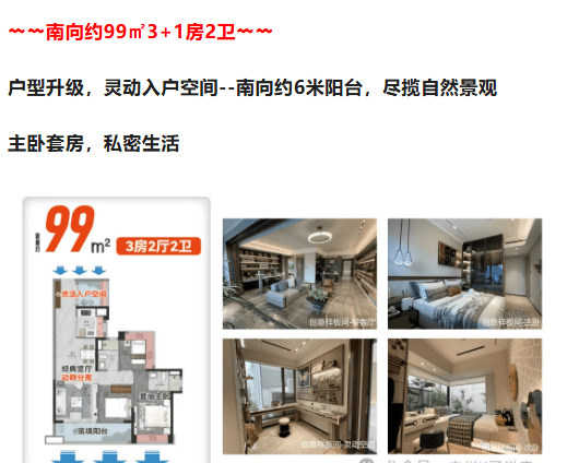 99㎡3+1 房 2 卫:刚改爆款户型,全南向布局,约 6 米南向阳台,尽揽中央园林或山景;主卧套房设计(带独立卫浴 + 飘窗),私密性强;LDK 一体化设计(客厅、餐厅、厨房连通),空间通透;灵动空间可作为书房或储物间,功能性完善,适合三口之家,兼顾居住与成长需求。