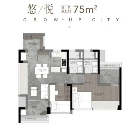 建面约75㎡三空间两卫:作为年轻人主城上车的首选户型,该户型采用四开间朝南设计,全明转角玄关,入户即能感受到通透的空间氛围。开放式厨房设计,让烹饪区域与餐厅、客厅相连,增强了空间的互动性;开阔景观阳台不仅拓展了视野,还能满足日常晾晒和休闲需求。主卧采用南北对流设计,配备独立衣帽间和卫生间,保障了居住的私密性和舒适度,让小户型也能拥有高品质的居住体验。