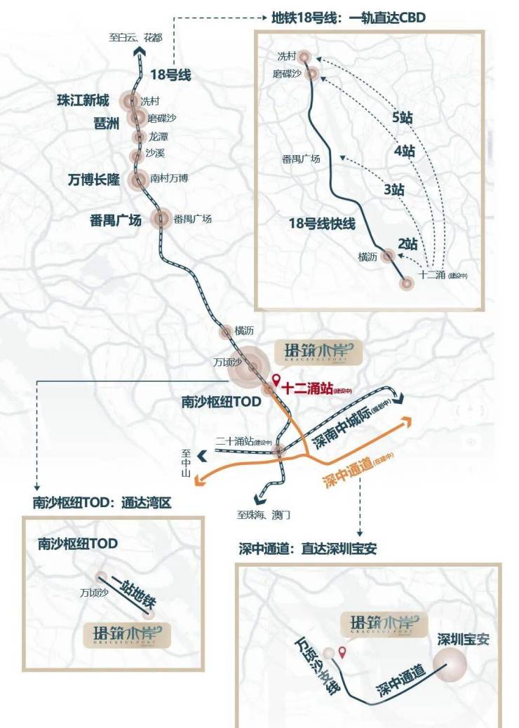 珺筑水岸区位优势明显 紧邻深中通道口 作为连接广州与深圳的重要交通通道 深中通道的存在使得项目在湾区联动中占据战略性位置 未来出行便捷度将随着区域轨道与主干路网的完善持续增强 项目周围具备多样化交通选择 地铁十八号线未来将穿境而过 带来高效的轨道通勤能力 高速公路网络与城际通道形成广域联通 例如南沙大桥虎门大桥等枢纽构成了覆盖珠三角的快速通道 轨道高铁和城际线路的联动使得湾区多城一小时通勤成为可能 对于在湾区内工作 考虑跨城通勤或有商务需求的家庭 珺筑水岸能够提供便捷的交通条件 同时项目依托海港与邮轮母港等海上交通 优化了跨区域休闲与出行结构 使得居住在此既可享受都市级别的交通便利 又能保持滨海区相对安静的居住体验 交通利好与配套兑现将持续推动区域价值上行 珺筑水岸售楼处24小时电话400-6557-087 (售楼部认证),预约专属顾问一对一服务,尊享内部折扣!