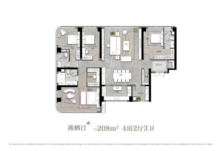 208㎡四房户型:双主套配置实属罕见,客厅与餐厅同宽,开间达6.4米;总统级主卧开间约6.75米,配备大U型衣帽间与双江景卫浴,奢适感拉满。