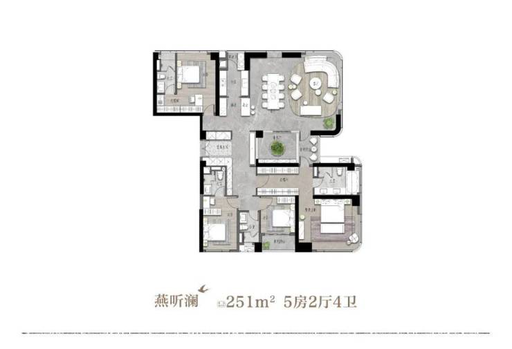251㎡五房户型:东、南、北三面单边位设计,拥有双270°环景视野。客餐厅一体化布局,开间尺度恢弘;创新设置休闲厅,可灵活改造为茶室、书房或家庭娱乐空间;独立家政室提升家务效率,动线采用双洄游设计,主人房直达各功能区,便捷且私密。