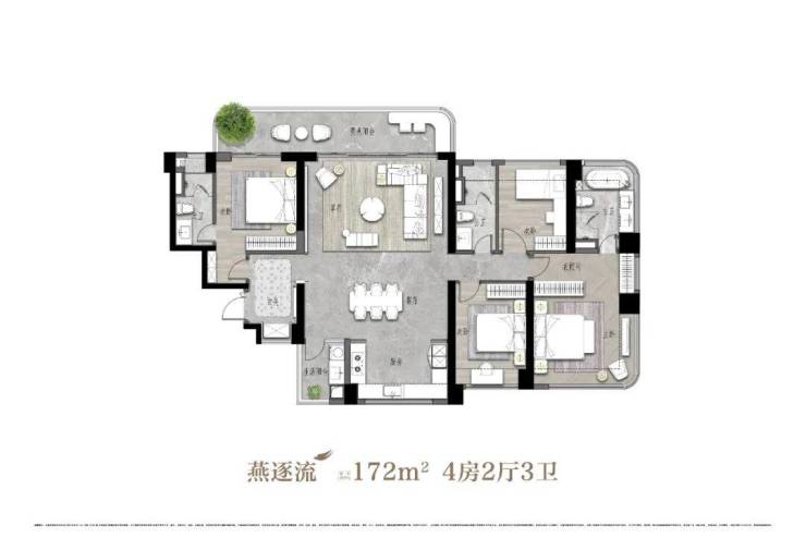 172㎡四房户型:方正实用,客厅开间约6米,搭配9.4米超大观景阳台,进深达1.8米。不仅客厅可览东平河一线江景,连主卫浴缸位置也能望江,而卧室则朝向社区园林与内河,静谧宜人。