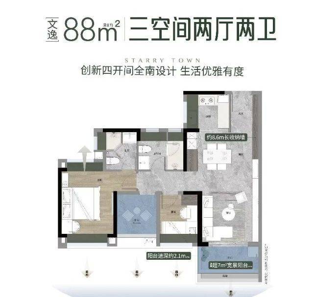 目前在售的户型涵盖多个面积段,满足不同家庭的需求,其中建面约88㎡3空间2厅2卫,是罕见的四面宽小户型,朝南居家生活,三卧室朝南,超11米景观线,与阳光无限亲近,精细化收纳设计,约10米收纳墙,藏纳全家人的爱好,适合三口之家或刚需家庭居住,既能满足日常居住需求,又能兼顾一定的休闲功能,性价比极高。