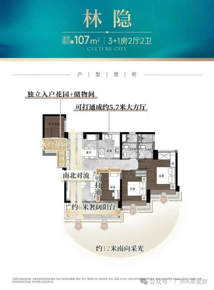 建面约107㎡的四房,拥有12米南向采光面,通透LDK一体化、约6米奢阔阳台,且带有独立入户花园。