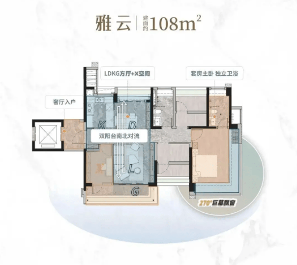 建面108㎡户型分为A、B两个户型,专为改善型家庭设计,均配备双阳台,实现空气对流,日常通风换气更高效。其中B户型亮点十足,带有独立玄关入户,既能增加收纳空间,又能提升归家仪式感;动静分离设计让公共区域与休息区域互不干扰,家里来客人时也不会影响家人休息。厨房与餐客厅衔接自然,动线合理,做饭时能随时关注客厅里的家人,收纳空间充足,各类生活用品都能妥善安放,适配二胎家庭或三代同堂的居住需求。