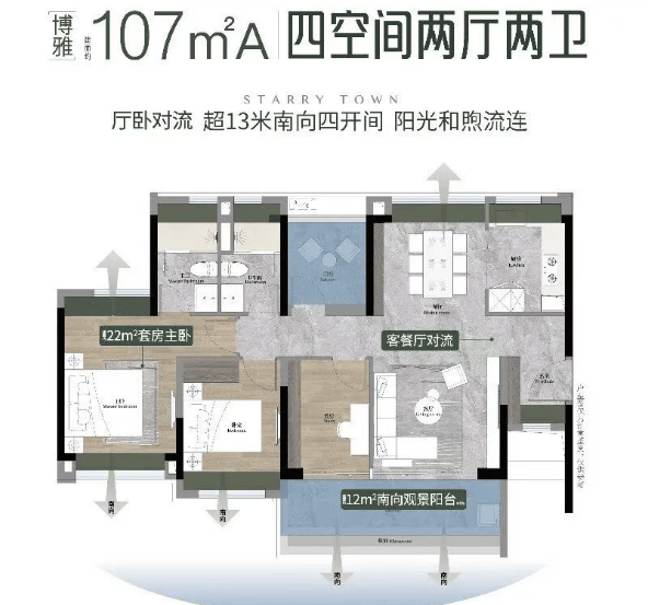 作为项目中的“旗舰户型”,125㎡实现了餐客一体化的大方厅设计,南北通透,空间感拉满。双面宽阳台进一步放大景观优势,主卧套房配置齐全。无论是多孩家庭还是需要居家办公的高知人群,都能在此找到理想的生活场景。