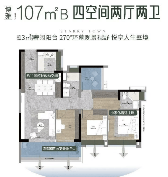 越秀·大学·星汇城二期目前在售四款主力户型,面积从88㎡到125㎡不等,全部采用朝南设计,并配备270°宽景大阳台,采光通风俱佳,实用率表现优秀。