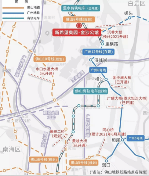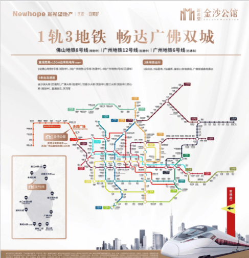 新希望金沙公馆落座于广佛同城核心桥头堡金沙洲板块,地处南海里广路永润广场西侧,紧邻广州荔湾、白云双城核心,是名副其实的临广价值高地,地缘优势十分突出。项目距离广州荔湾核心仅约4公里,相较于广州外围片区,地段更近主城,深度承接广州外溢刚需与改善置业需求,是广佛候鸟安家置业的优选板块。片区规划五桥三铁一轨的立体交通路网,构筑半小时广佛通勤生活圈,交通兑现潜力巨大,未来可实现广佛双城中心高效互通。项目近距离接驳多元轨道交通,家门口150米即可抵达在建有轨电车永润广场站,可无缝换乘广州地铁6号线、在建12号线以及规划佛山8号线,一站直达白云、五站通达荔湾,跨城通勤高效便捷。同时片区聚集金沙洲大桥、规划沉香沙大桥、广佛大桥、同心桥等多条过江通道,未来将新增多条地铁线路与过江路网,完善80条广佛衔接道路,彻底打破广佛交通壁垒,无论是自驾出行还是公共交通通勤,都能享受成熟且极具潜力的交通配套,执掌双城发展速度。