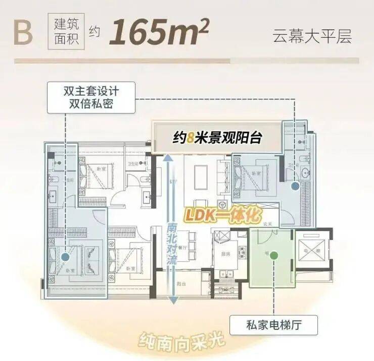 户型设计:主推98-220㎡三房至五房,全部做到南北对流,部分户型拥有双阳台设计,采光和通风条件优越。例如: