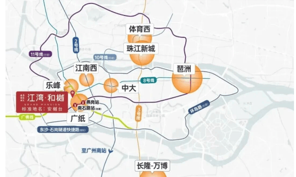 江湾和樾的交通配置堪称“三地铁环绕”:步行约800米即达地铁8号线沙园站(已运营),1.2公里内覆盖广佛线燕岗站,而备受期待的11号线(环线)南石头站距离仅约900米,预计2026年全线贯通后,将实现30分钟直达珠江新城、琶洲、金融城等核心CBD。自驾方面,项目紧邻在建的海珠环岛路,未来将串联“9纵9横”区域路网,快速接驳内环路、洲头咀隧道、鹤洞大桥。尤其对于广佛通勤族或海珠西本地改善客群,通勤效率大幅提升。值得注意的是,11号线作为广州首条地铁环线,其开通将彻底激活海珠西部价值,而江湾和樾恰好处在环线与8号线交汇辐射圈内,区位红利正在加速兑现。