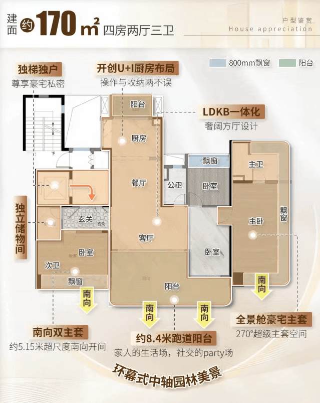 4.2 建面约一百七十平方米四房:全景舱视野与双主卧套房