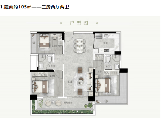 105㎡三房两卫:LDK一体化布局,主卧套房带独立卫浴,双卫设计提升家庭私密性;