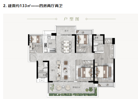 133/138㎡四房两卫:四开间朝南,最大采光面达12米以上,主卧配备步入式衣帽间,灵动空间可灵活改造为书房或儿童房。